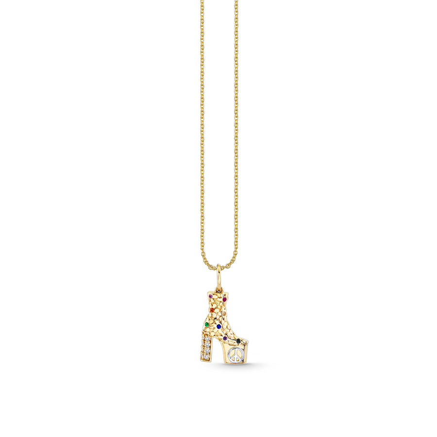 14k yellow gold and diamond platform shoe charm with rainbow gemstones. The charm measures appx. 1/2"H x 3/8"W. Fine 14k gold cable chain is 16" long with an extender at 18".