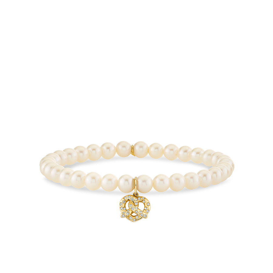 Delicate 14k gold pretzel charm adorned with sparkling diamonds, strung on lustrous freshwater pearl beads. This charming bracelet combines whimsical elegance with timeless sophistication. The 5mm round pearls create a soft, luminous base that beautifully complements the gleaming gold and diamond details. Perfect for layering or wearing solo, this piece adds a playful yet refined touch to any jewelry collection.