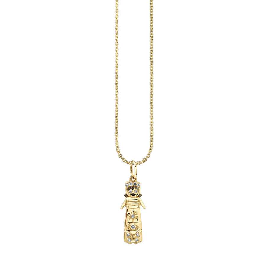 Embrace protection and positive energy with this charming 14k yellow gold and diamond protection doll charm necklace from our Worry Doll Collection. The delicate charm, measuring approximately 1/2" by 1/8", features a starburst, protective eye, and butterfly motifs on her skirt, symbolizing hope, safety, and transformation.