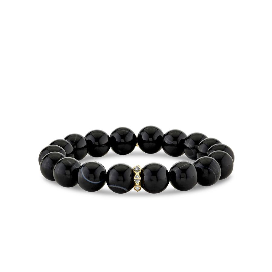 Elevate your style with this exquisite bracelet featuring a stunning 14k gold pyramid eternity rondelle adorned with brilliant diamonds, elegantly set against 10mm smooth sardonyx beads. Each sardonyx bead is unique, with natural variations in color and shape that add to the bracelet’s distinctive charm.