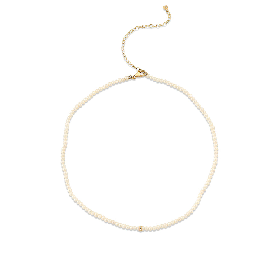 Indulge in the ultimate symbol of love and luxury with our Gold & Diamond Rondelle Pearl Necklace. Crafted with the finest 14k yellow gold, this necklace exudes elegance and sophistication. The centerpiece of this exquisite piece is a dazzling diamond rondelle, adding a touch of sparkle and glamour.