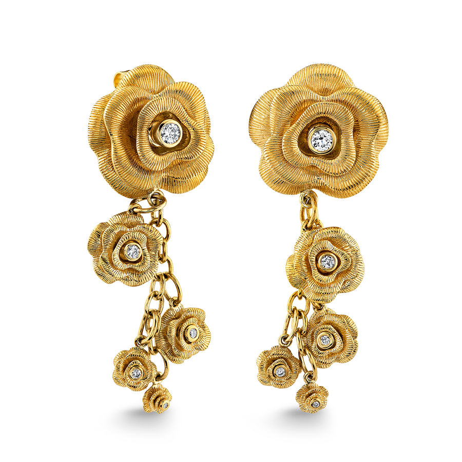 Crafted from 14k gold, these rose charm earrings feature a cascading design of delicate roses, gracefully dangling from largest to smallest. Each bloom is adorned with a diamond at its center, adding a touch of brilliance to the intricate floral details. The movement of the cascading roses enhances their elegance, creating a romantic yet refined statement. A perfect blend of charm and sophistication, these earrings capture the timeless beauty of nature in a luminous, elegant form.
