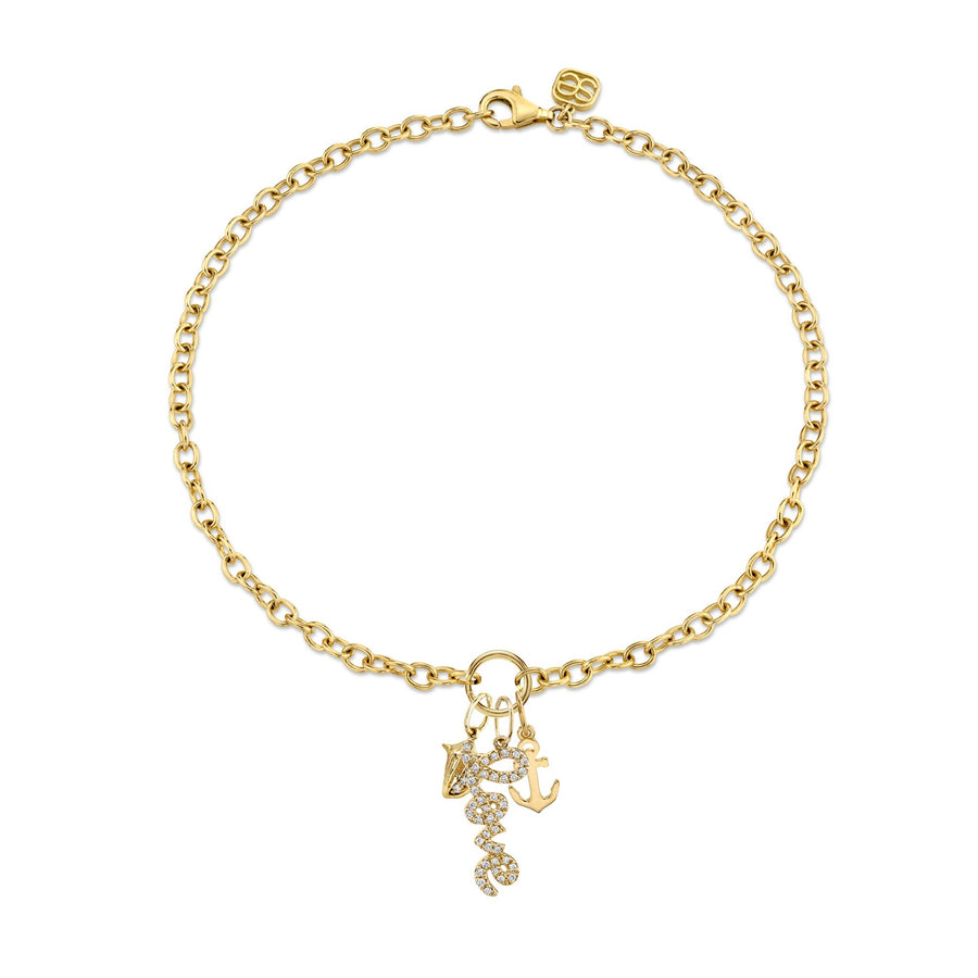 Made with 14k yellow gold and sparkling diamonds, this anklet features three charming sea life symbols: a tiny anchor, a small love script, and a tiny conch shell. Each charm is carefully soldered onto a delicate 14k gold oval link chain, creating a beautiful and unique piece.