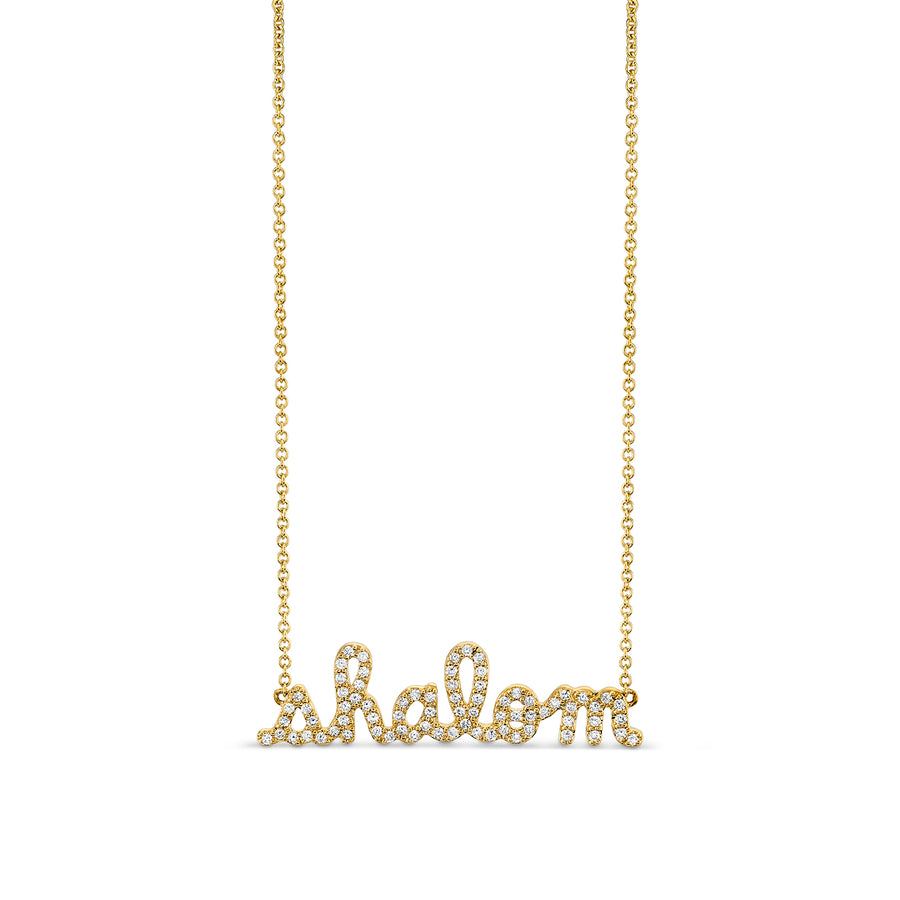 Crafted from 14k yellow gold and adorned with sparkling diamonds, this necklace features the word 'Shalom' written in elegant script. The fine 14k gold cable chain adds a delicate touch to the overall design, making it perfect for everyday wear or special occasions.