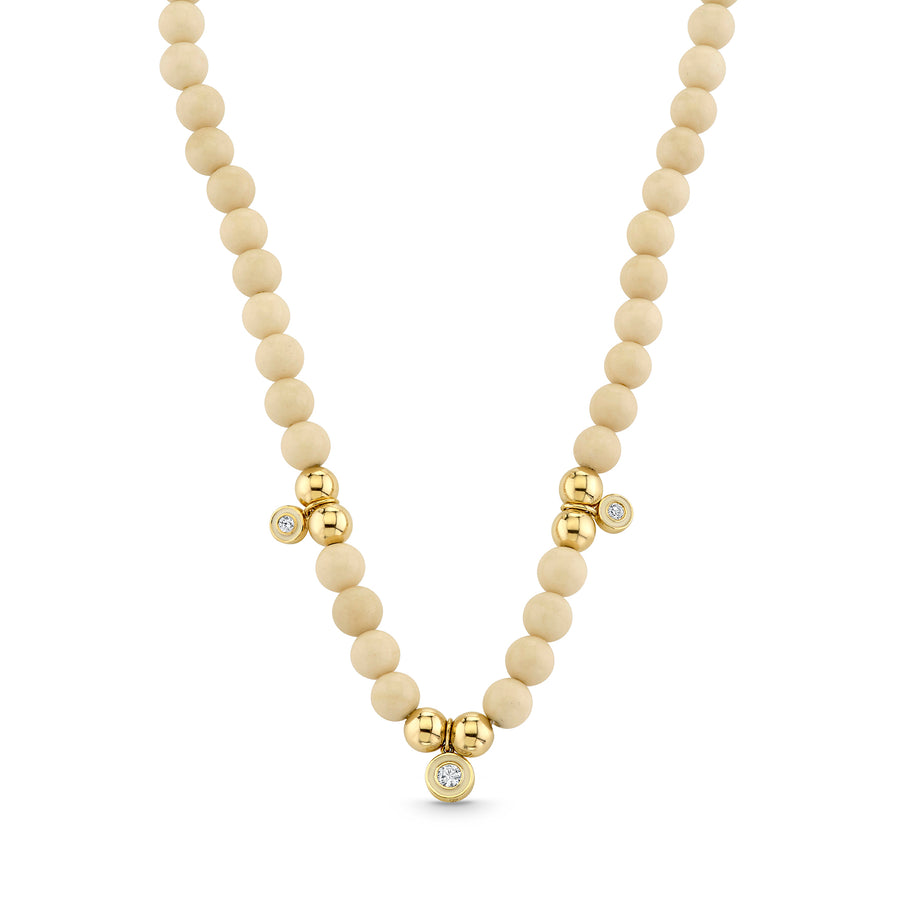 Handcrafted in radiant 14k gold, this beaded necklace weaves together luminous white coral beads, polished gold accents, and round enamel charms—each crowned with a brilliant diamond at its center. White coral, long associated with protection and harmony, pairs beautifully with gold’s warmth and diamond’s enduring light, creating a design that symbolizes balance, purity, and timeless elegance. The mix of textures and colors gives the piece a refined yet modern feel, making it a versatile treasure for both everyday wear and special occasions.