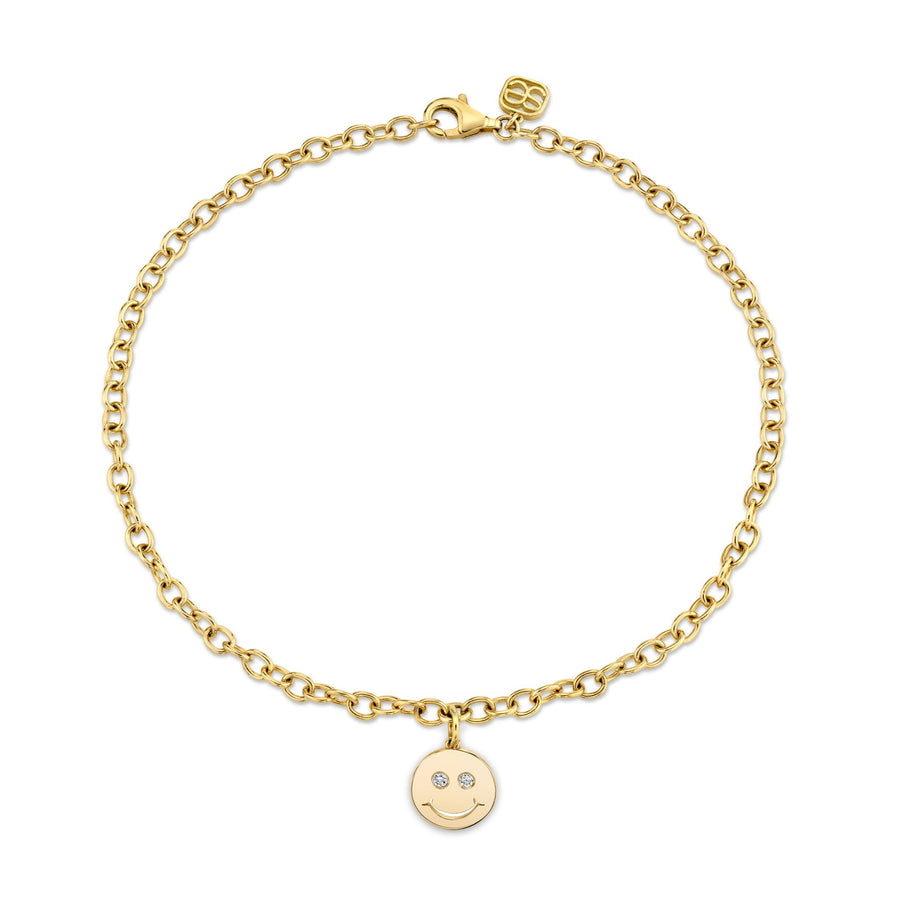 Add a joyful touch to your look with this 14k yellow gold anklet featuring a charming happy face charm set with sparkling diamond eyes. Symbolizing positivity and lighthearted energy, this cheerful design is perfect for those who love to wear their smile.