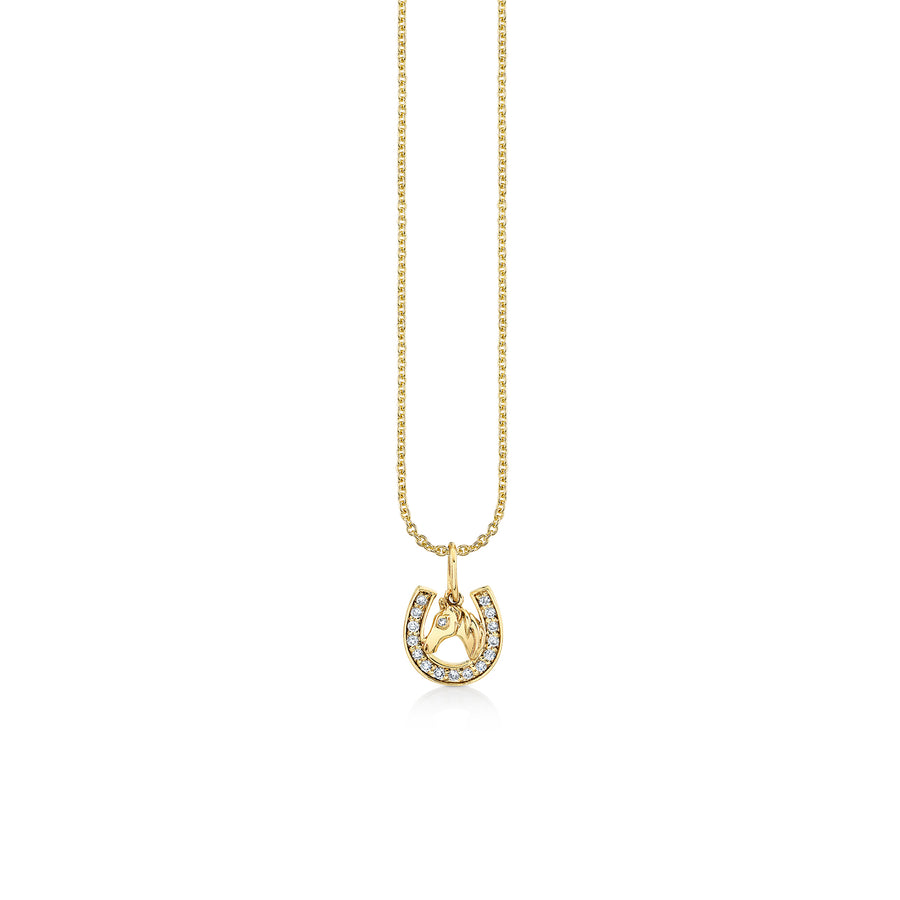 Celebrate strength, luck, and timeless elegance with this 14k yellow gold and diamond small horseshoe charm necklace featuring a detailed horse head. The charm measures approximately 3/8" H x 3/8" W and is suspended from a delicate fine 14k gold cable chain measuring 16" with an 18" extender for versatile styling.