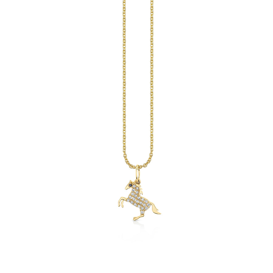Celebrate strength and grace with this small horse charm necklace, crafted in 14k yellow gold and accented with pavé-set diamonds. A black diamond eye adds a striking detail to this symbolic piece. The charm measures approximately 1/2" x 1/2" and hangs from a fine 14k gold cable chain, adjustable from 16" to 18".