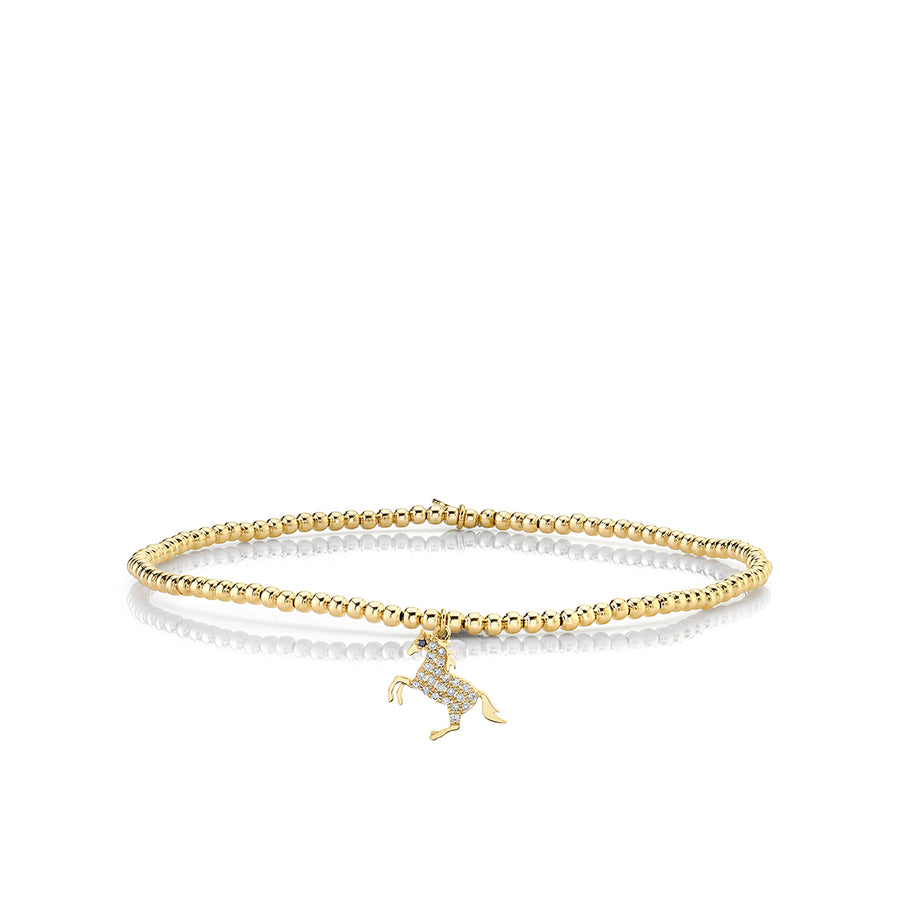 14k gold and diamond small horse charm on 2mm 14k gold beads. All Sydney Evan beaded bracelets are strung on a stretch cord along with our 14k gold SE logo charm. Standard size is approximately 6.25", for all custom size requests, please contact us.