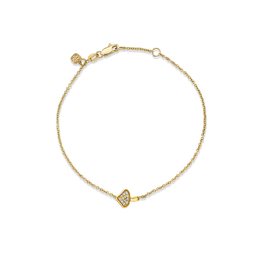 Introducing our enchanting 14k yellow gold and diamond small mushroom bracelet, where whimsy meets elegance. The petite mushroom charm, measuring approximately 1/4' in width and height, is delicately adorned with a sparkling diamond, symbolizing purity and strength. Each charm is meticulously soldered onto a 14k gold medium cable chain, creating a seamless blend of craftsmanship and charm. The bracelet measures approximately 6.75', with an additional loop at 6.25' for a customizable fit. Embrace the allure of nature's charm with this beautifully crafted piece, perfect for adding a touch of magic to any occasion.