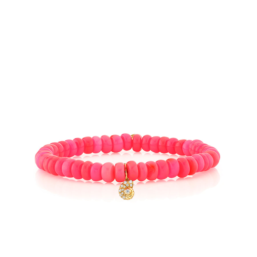 Crafted from 14k gold, this small nautilus shell charm is adorned with diamonds and suspended on 6mm hot pink Ethiopian opal smooth rondelles. The vibrant, pink opals beautifully enhance the delicate nautilus charm, symbolizing growth and transformation. A piece that blends elegance with meaningful design, adding a bold yet graceful touch to any collection.