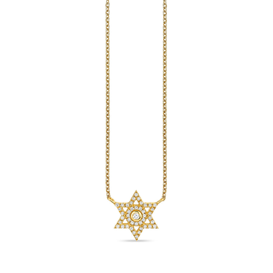 The combination of gold and diamonds creates a luxurious and eye-catching look that is sure to make a statement. The intricate design of the star of David adds a touch of elegance and symbolism to this necklace, making it a meaningful piece for those of the Jewish faith.