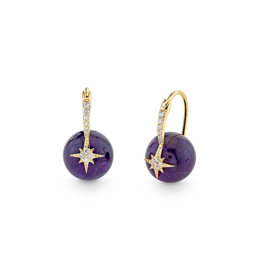 14k yellow gold starburst bead earrings celebrate celestial beauty and timeless elegance. Each earring features a radiant starburst design adorned with pavé-set diamonds, symbolizing brilliance and hope. Suspended beneath are luminous 10mm or 12mm amethyst beads, known as stones of protection, wisdom, and tranquility. The earrings measure approximately 5/8" in height and 3/8" in width, perfectly sized to frame the face with subtle sophistication. Crafted from fine 14k yellow gold, the hinged wire closure ensures both security and comfort, making these earrings a refined addition to any jewelry collection.