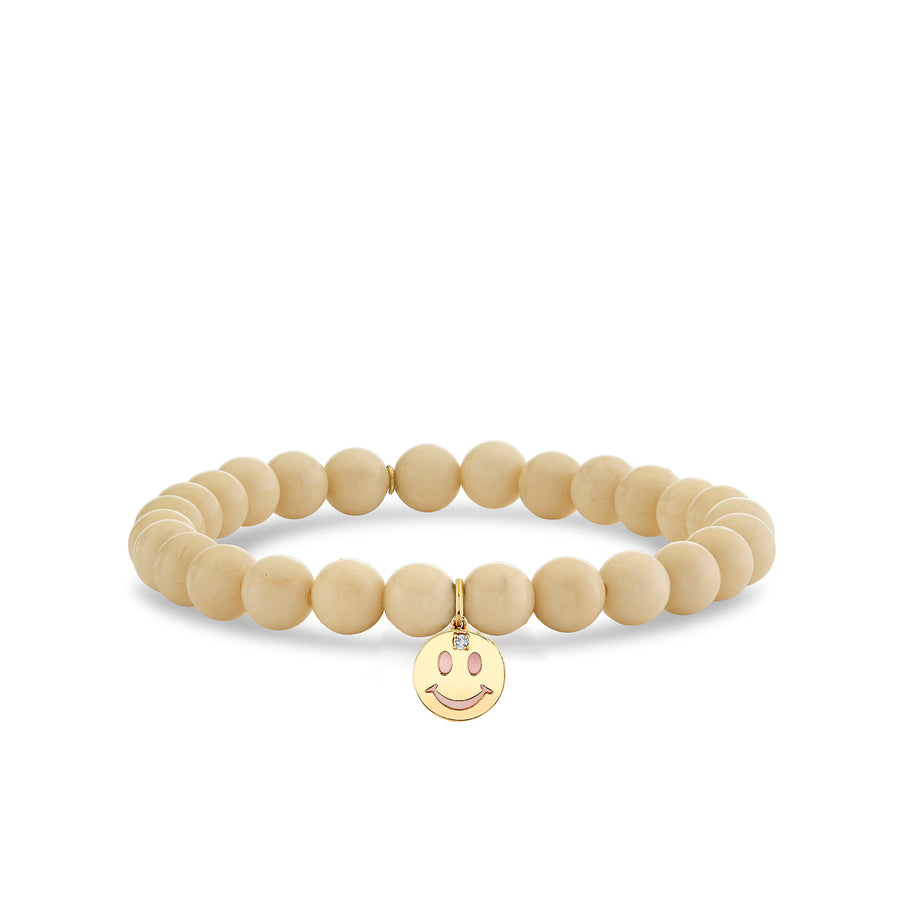 Radiant joy meets refined elegance in this exquisite charm bracelet. Crafted in 14k gold, the centerpiece features a luminous happy face icon adorned with delicate pink mother-of-pearl inlay and crowned with a single diamond accent. Strung on smooth 6mm white coral beads, this piece combines meaningful symbolism with timeless sophistication. Perfect for layering or wearing solo, it's a wearable reminder to embrace life's brighter moments with grace and style.