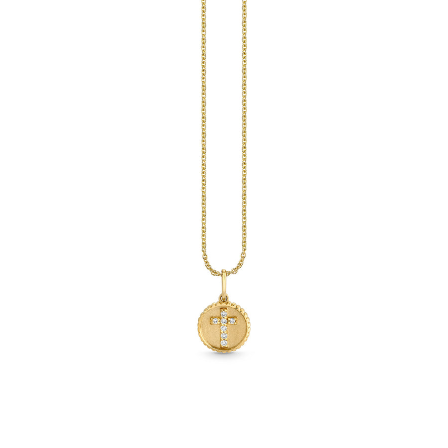 This exquisite gold and diamond tiny cross coin charm, measuring approximately 3/8"W x 3/8"H, captures a delicate yet meaningful design. Its intricate detailing is enhanced by shimmering diamonds, adding a touch of elegance. Perfect for layering or as a subtle statement piece, this charm beautifully combines faith and artistry, making it a cherished addition to any jewelry collection.