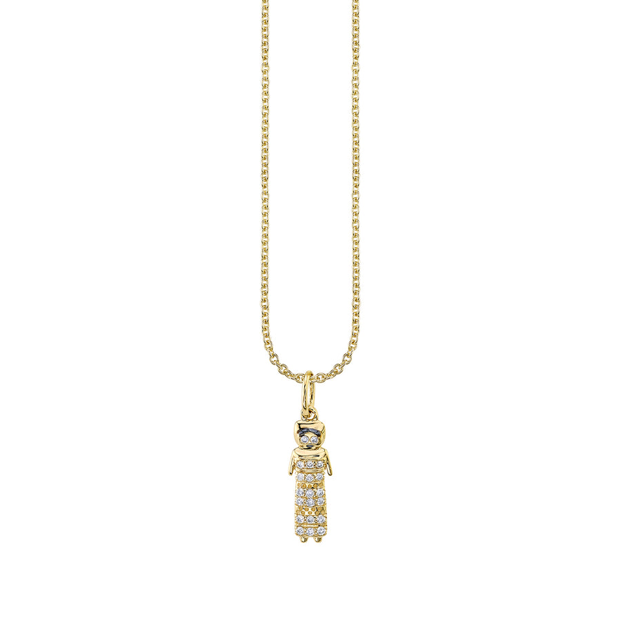 Delicately crafted, this 14k yellow gold and diamond tiny doll charm necklace from our Worry Doll Collection measures approximately 1/2" by 1/8". Strung on a fine 14k gold cable chain adjustable between 16" and 18", it offers a subtle yet meaningful touch of elegance.