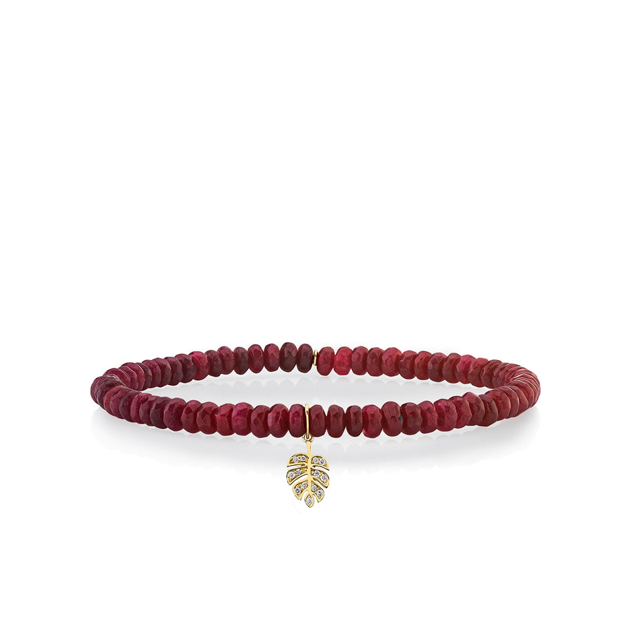 Celebrate the beauty of nature with this elegant 14k yellow gold tiny monstera leaf charm, delicately adorned with diamonds for a subtle sparkle. The charm measures approximately 3/8" H x 1/4" W and rests gracefully on smooth 4mm dark red jade beads, known for their grounding and protective qualities.