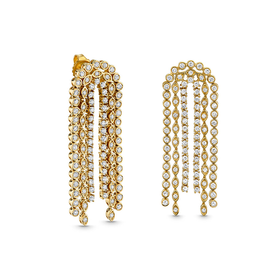 Made from 14k yellow gold, this earring features a trio of delicate chains that dangle beautifully. The chains are adorned with sparkling diamonds, adding a touch of luxury to the design.