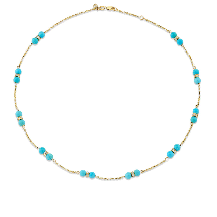 Crafted from 14k gold, this bead station necklace features a refined arrangement of vibrant turquoise beads and diamond rondelles, creating a striking balance of color and brilliance. Designed to add a touch of radiance to any collection, it’s a piece that speaks to both elegance and individuality.