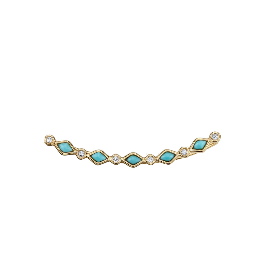 Elevate your ear game with this refined ear climber, crafted in 14k yellow gold and adorned with sparkling diamonds and captivating turquoise stones. The graceful climb design hugs the contour of your ear for an effortless, modern aesthetic that transitions seamlessly from day to evening. Each piece is sold individually, allowing you to mix, match, and layer for a personalized look. A timeless investment in understated luxury.