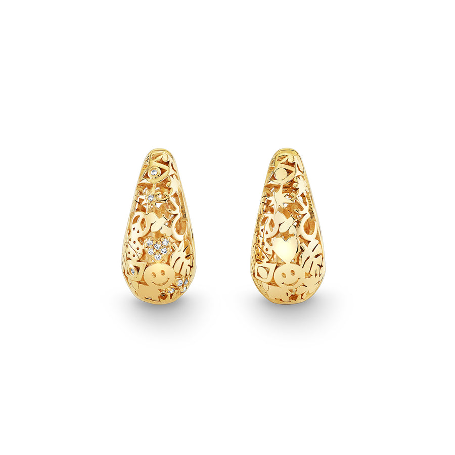 Elevate your style with these exquisite 14k yellow gold and diamond wallpaper icon domed huggie hoops. Crafted from luxurious 14k gold, these huggies feature a distinctive domed design adorned with a chic wallpaper icon motif, adding a touch of sophistication to any look. The delicate, yet radiant diamonds are meticulously set, offering a subtle sparkle that catches the light beautifully.