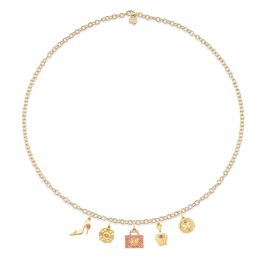 The Glinda Multi-Charm Necklace from the Wicked x Sydney Evan collection features 14k yellow gold and exquisite gemstone detailing, celebrating the charm and whimsy of Glinda's world. This unique 18" necklace showcases five meticulously crafted charms, each adorned with sparkling pink sapphires and diamonds: a playful high-heel charm, a delicate flower, a dazzling luggage charm, a mystical potion bottle, and a tiny butterfly coin highlighted with amethyst. Each charm is permanently soldered onto a fine small oval link chain, ensuring timeless elegance with every wear. Perfect for collectors and those enchanted by the world of Wicked.