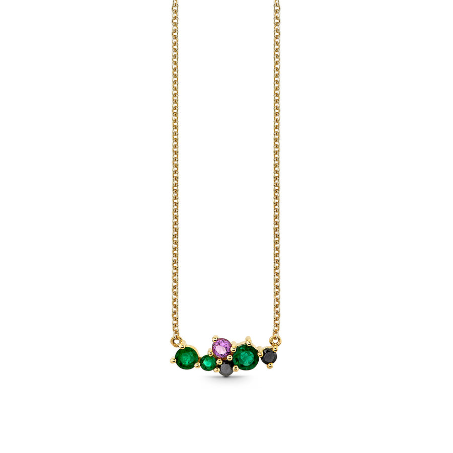 Crafted from 14k gold, this enchanting cocktail bar necklace is a true celebration of color and elegance. Adorned with vibrant emeralds and rich amethysts, each gemstone is meticulously set to create a striking visual impact. The unique design captures a whimsical spirit, making it a standout piece for any jewelry collection. With its luxurious gold backdrop, this necklace effortlessly transitions from casual to formal occasions, adding a touch of sophistication to any outfit.