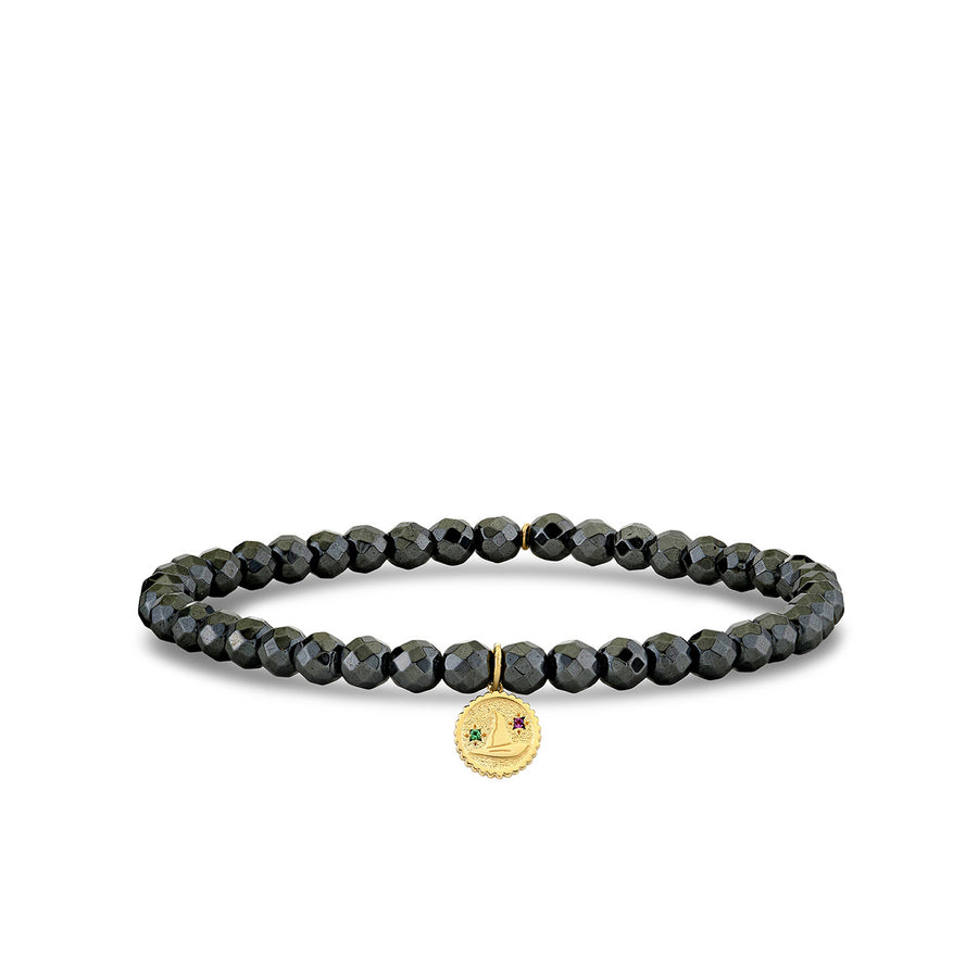 Crafted from 14k gold, this distinctive bracelet showcases a tiny coin charm featuring an elegant hat, embellished with an emerald and an amethyst. It rests gracefully on a polished hematite faceted round, creating a striking contrast that elevates the design. This piece seamlessly blends sophistication with a contemporary edge, making it an exceptional addition to your jewelry collection.