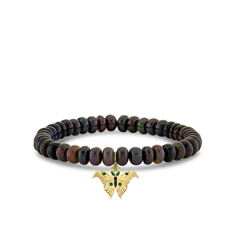 Crafted from 14k gold, this captivating bracelet features an enchanting enamel moth charm accented with a vibrant emerald that adds a pop of color. The intricate design beautifully captures the essence of nature, making it a perfect accessory for those who appreciate whimsical elegance. The black opal smooth rondelle beads provide a rich, dramatic backdrop that enhances the charm's allure.