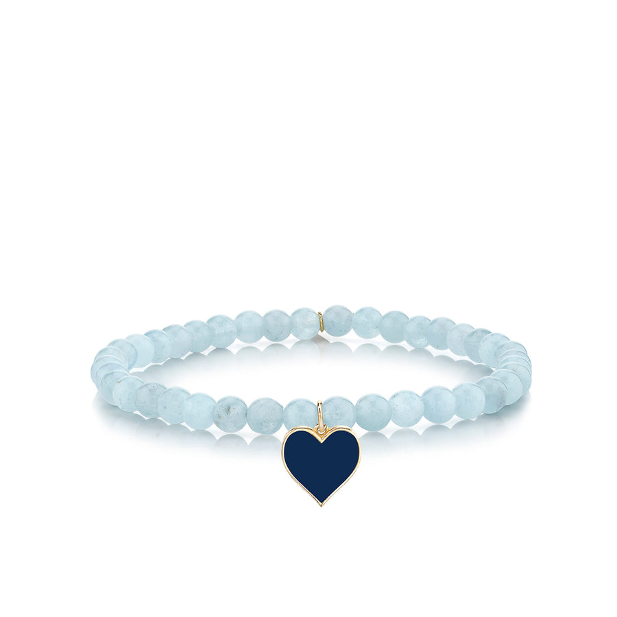 Add a touch of serene beauty with this 14k yellow gold and navy enamel small heart charm bracelet, featuring a charming heart measuring approximately 3/8" high x 3/8" wide. The charm rests gracefully on smooth 4mm round aquamarine beads, prized for their calming blue hues and natural elegance.