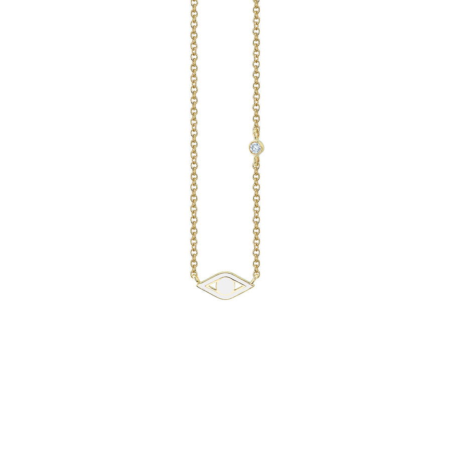 Wear a symbol of protection and good fortune with this elegant 14k yellow gold and enamel mini protective eye necklace, featuring a sparkling bezel-set diamond for added brilliance. The charm measures approximately 1/8" x 1/4", delicately suspended from a fine 14k gold cable chain with a versatile length of 16" plus an 18" extender for customizable styling.