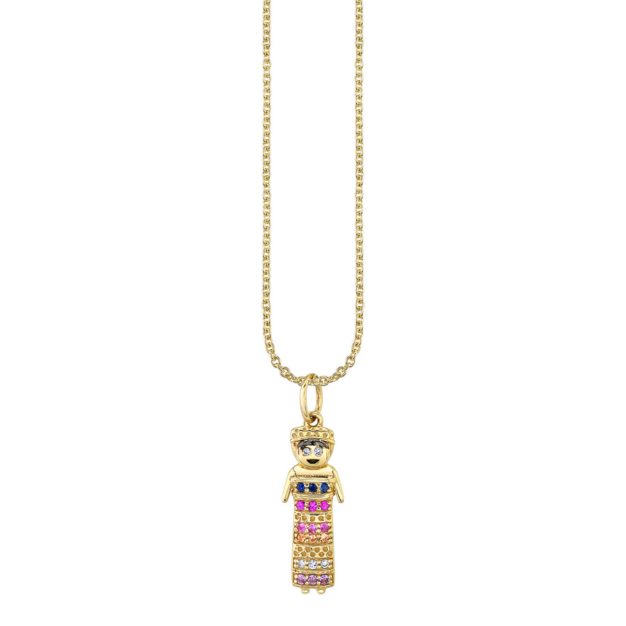 Brighten your jewelry collection with this charming 14k yellow gold doll charm necklace from our Worry Doll Collection. The playful charm measures approximately 5/8" by 1/4" and is adorned with an array of vibrant blue, pink, and orange sapphires, amethysts, and sparkling diamonds.