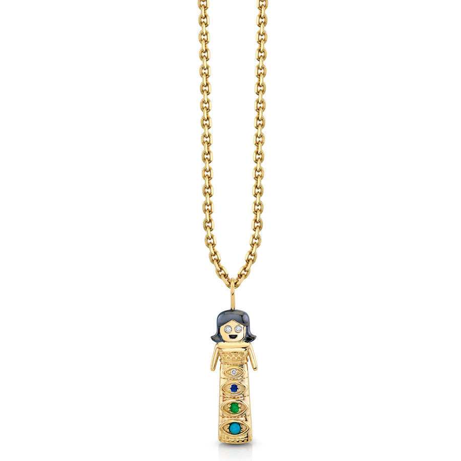 14k yellow gold large marquis eye doll charm necklace from our worry doll collection features a blue sapphire, an emerald, a turquoise and three diamonds. Charm measures approximately 3/8"W x 1"H".Fine 14k gold heavy cable chain is 16" long with an extra loop at 18".