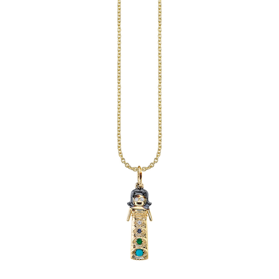 Discover a symbol of hope and serenity with this 14k yellow gold marquis eye doll charm necklace from our Worry Doll Collection. Featuring a vibrant mix of gemstones — a blue sapphire, emerald, turquoise, and three sparkling diamonds — this charm measures approximately 5/8" by 1/4".