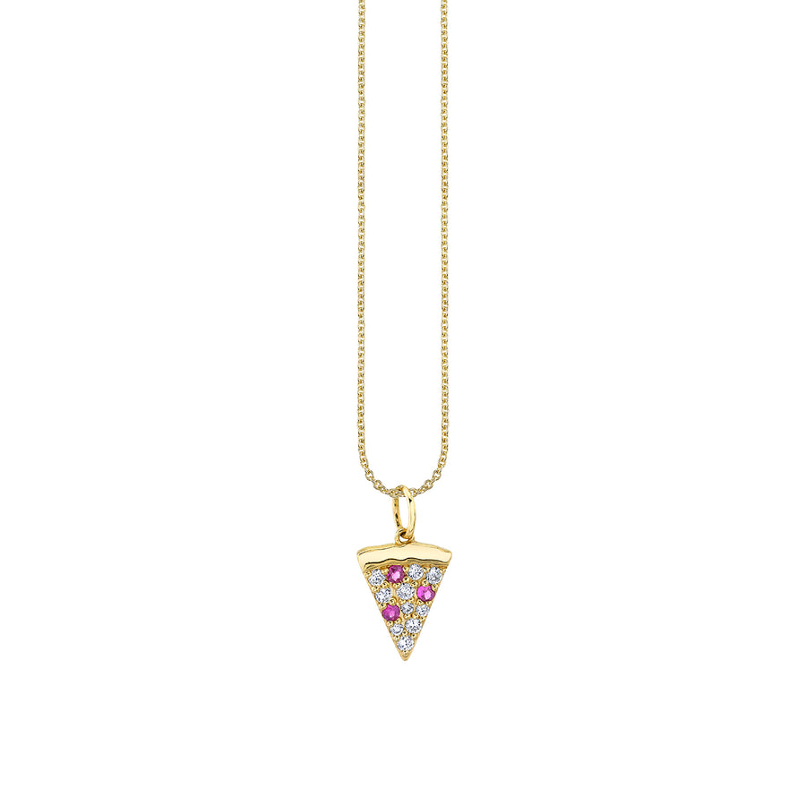 A sparkling slice of joy—this 14k yellow gold pizza charm necklace is a bold, playful twist on fine jewelry. The large pizza slice is set with pavé diamonds and rich red rubies, adding a luxe touch to everyone's favorite comfort food. A symbol of indulgence, friendship, and celebration, this charm is perfect for anyone who believes in treating themselves and savoring life’s delicious moments.