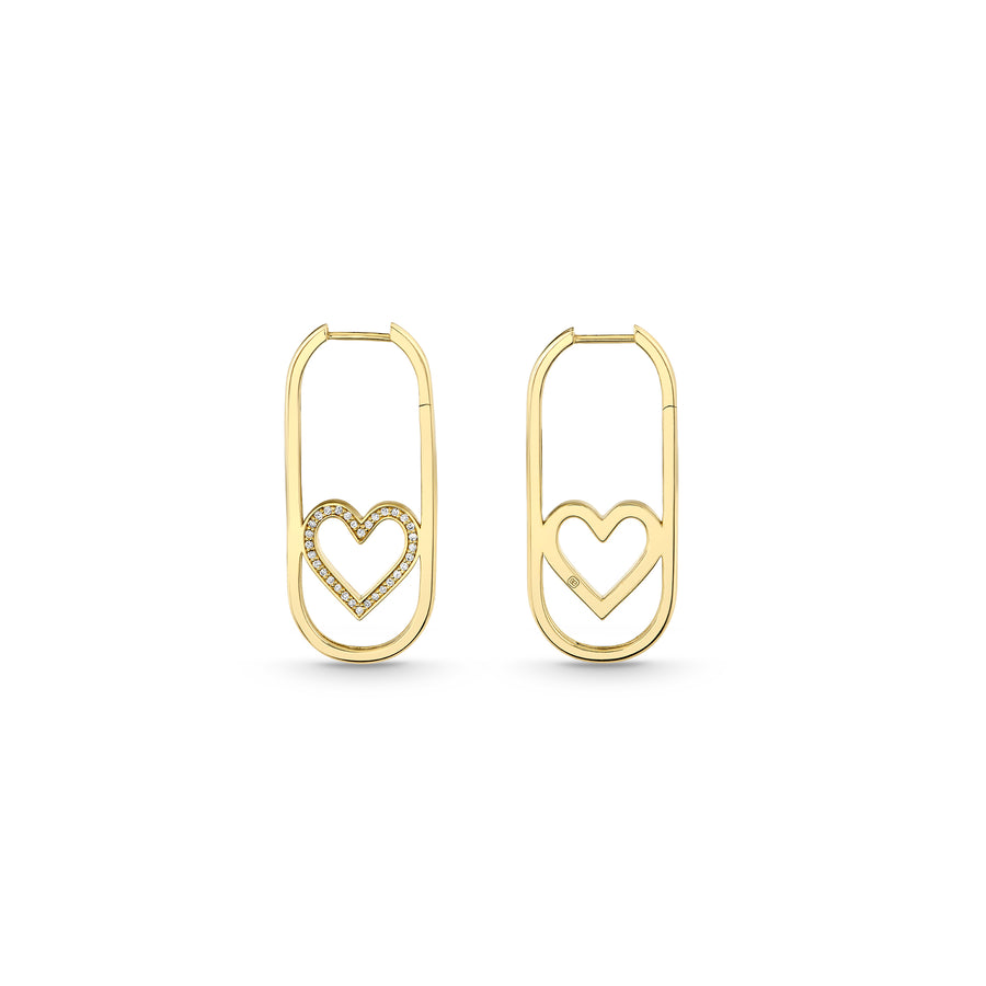 Elevate your elegance with these enchanting 14k yellow gold open heart hoops, adorned with exquisite pave diamonds. Each hoop features a delicate open-heart design, symbolizing love and grace. The heart is meticulously encrusted with shimmering diamonds, adding a touch of sparkle to your ensemble.