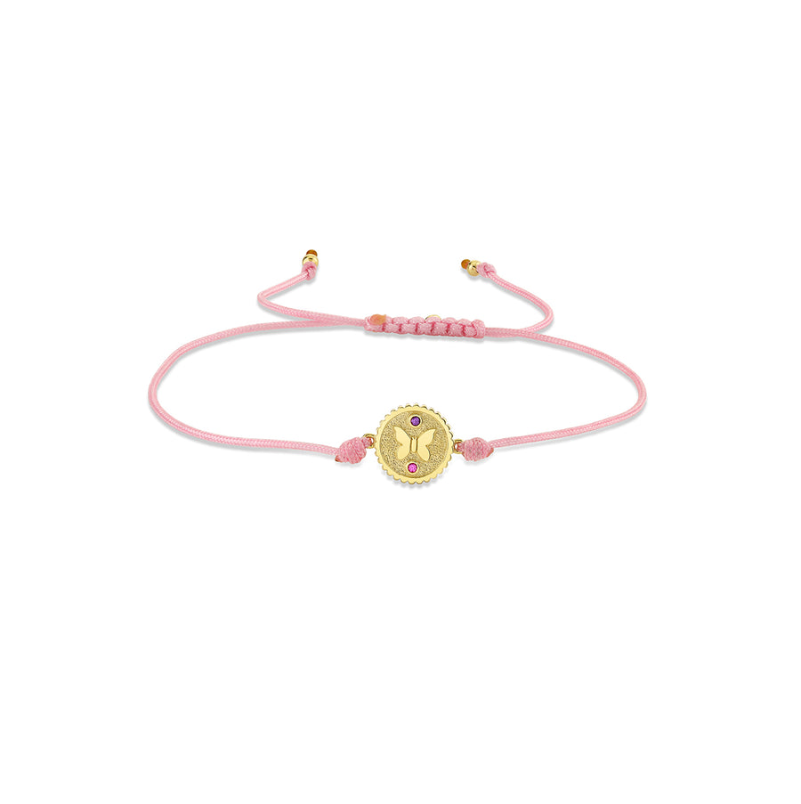 Crafted from 14k gold, this charming bracelet features a delightful butterfly tiny coin charm adorned with a vibrant pink sapphire and a stunning amethyst. The whimsical design captures a sense of joy and playfulness, making it a perfect accessory for adding a touch of fun to any outfit. The pink cord bracelet provides a soft, casual look that beautifully complements the charm. Ideal for wearing solo or layering with other pieces, this bracelet brings a cheerful flair to your style.