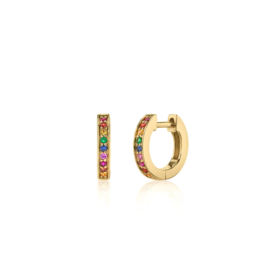 Add a burst of color and sophistication with our 14k Gold Rainbow Bar Huggie Hoop Earrings, featuring a stunning pavé setting of rubies, emeralds, and multi-color sapphires. Available in your choice of yellow gold or rose gold, these hoops bring a playful yet refined sparkle to any ensemble.