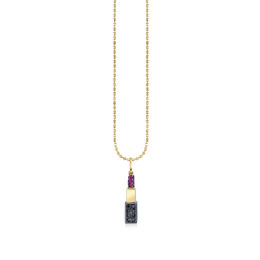 14k yellow gold small lipstick charm with pavé-set rubies and black diamonds. The charm measures appx. 1/2"H x 1/8"W. Fine 14k gold ball chain is available in 16" or 18".