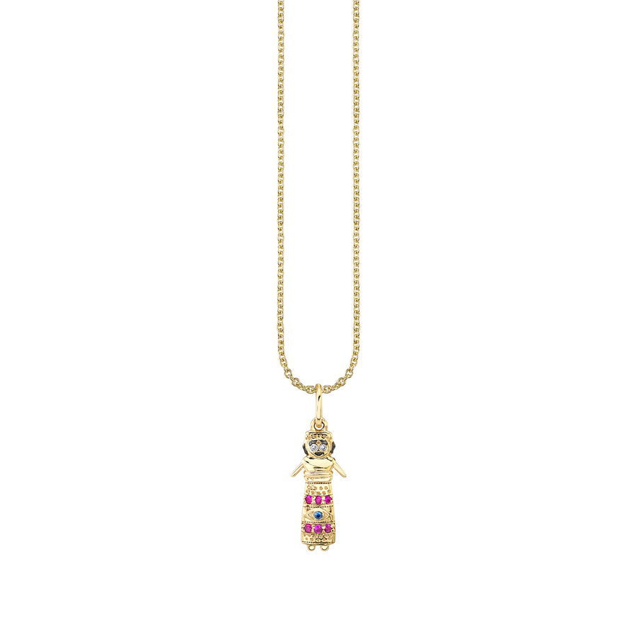 Carry a symbol of protection and vibrant energy with this 14k yellow gold and ruby tiny protective eye doll charm necklace from our Worry Doll Collection. The delicate charm measures approximately 1/2" by 1/8" and features a ruby-accented protective eye, adding a touch of color and meaning.