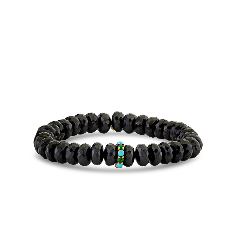 Adorn your wrist with this stunning Sydney Evan beaded bracelet, featuring a 14k yellow gold rondelle adorned with vibrant turquoise and emerald stones, elegantly set against 8mm black spinel faceted beads. The rich contrast between the lustrous gold and the deep black spinel creates a captivating piece that exudes both luxury and sophistication. Strung on a durable stretch cord, this bracelet is finished with our signature 14k gold SE logo charm. The standard size is approximately 6.25". For custom sizing requests, please contact us.
