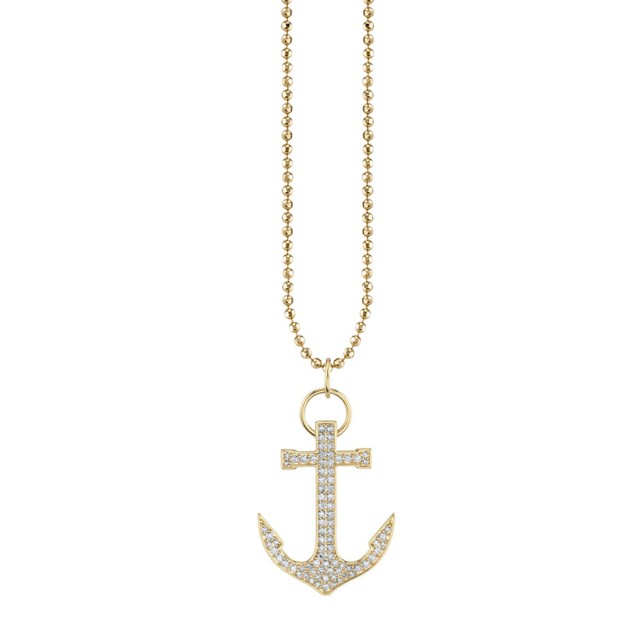This luxurious 14k yellow gold anchor necklace symbolizes stability, strength, and hope, making it a timeless piece to elevate any jewelry collection. The anchor, a classic emblem of steadfastness, is adorned with pavé-set diamonds that add a touch of sparkle and sophistication. The necklace is complemented by a fine 14k yellow gold heavy ball chain, available in 16", 18", or 20" lengths to suit your personal style.