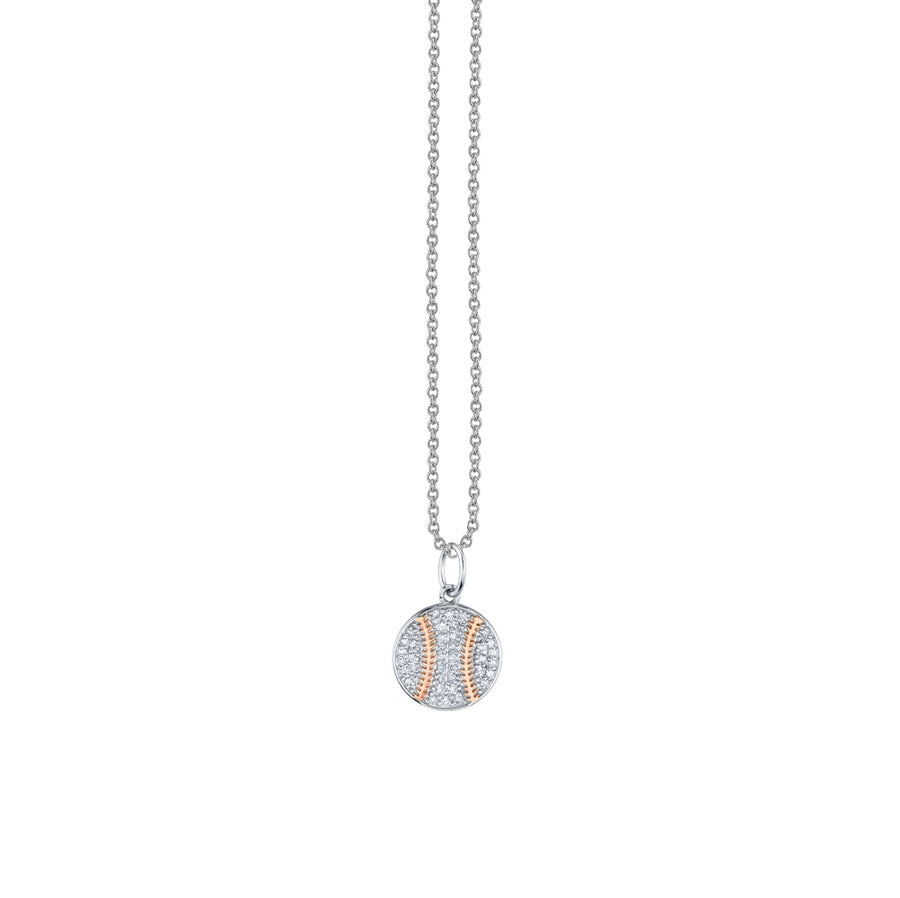 14k white gold and diamond baseball charm necklace from our Little Loves Collection. Fine 14k gold cable chain is 16" long with an extender at 18".