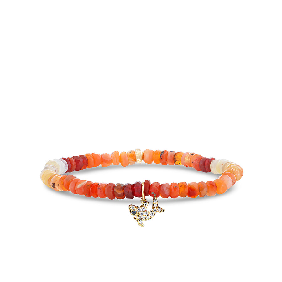 14k yellow gold and diamond small shark charm on 4mm fire opal faceted beads from our Little Loves Collection. All Sydney Evan beaded bracelets are strung on a stretch cord along with our 14k gold SE logo charm. Beads color and shape may vary slightly due to the nature of the precious and semi-precious stones. Standard size is approximately 5.5", for all custom size requests, please contact us.