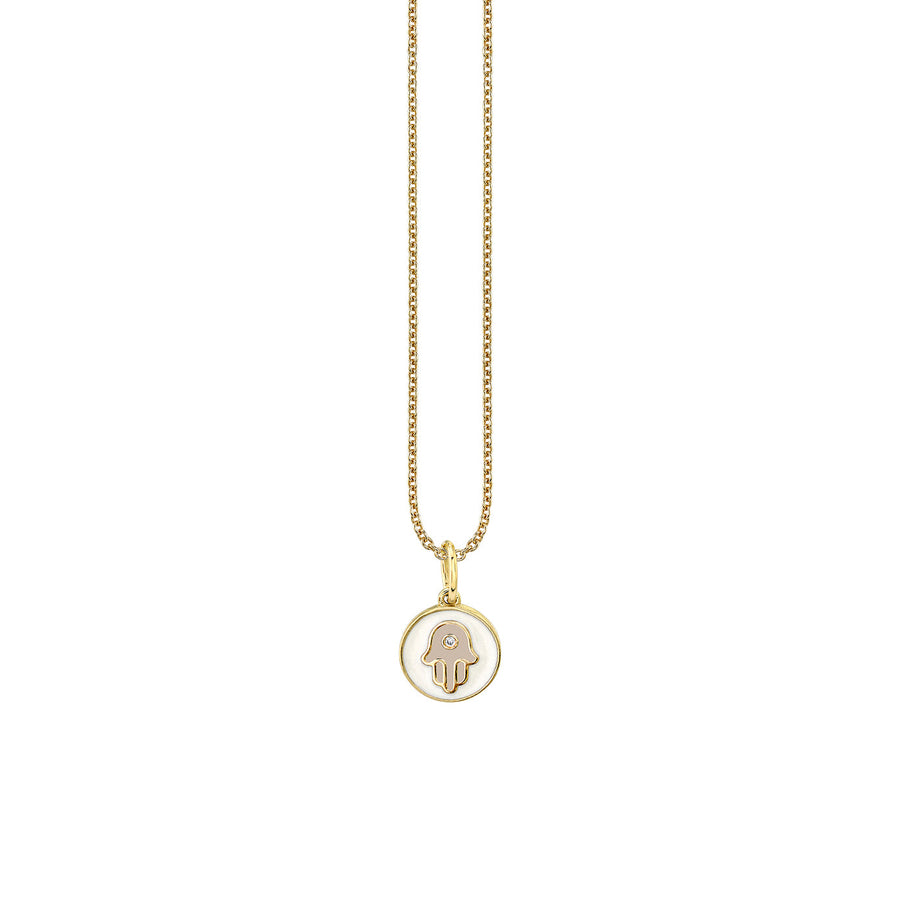 14k yellow gold and enamel tiny hamsa medallion necklace from our Little Loves Collection. Fine 14k gold cable chain is 16" long with an extender at 18". The medallion measures approximately 3/8" in diameter. Available in different enamel colors.