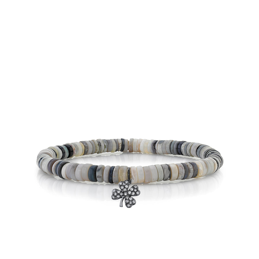 A symbol of luck, protection, and positive energy, this bracelet features a black rhodium-plated clover charm adorned with sparkling diamonds. Measuring approximately 3/8" in diameter, the charm is paired with 6mm multi-grey Australian opal heishi beads, known for their iridescent glow and metaphysical properties of intuition, emotional healing, and spiritual connection.