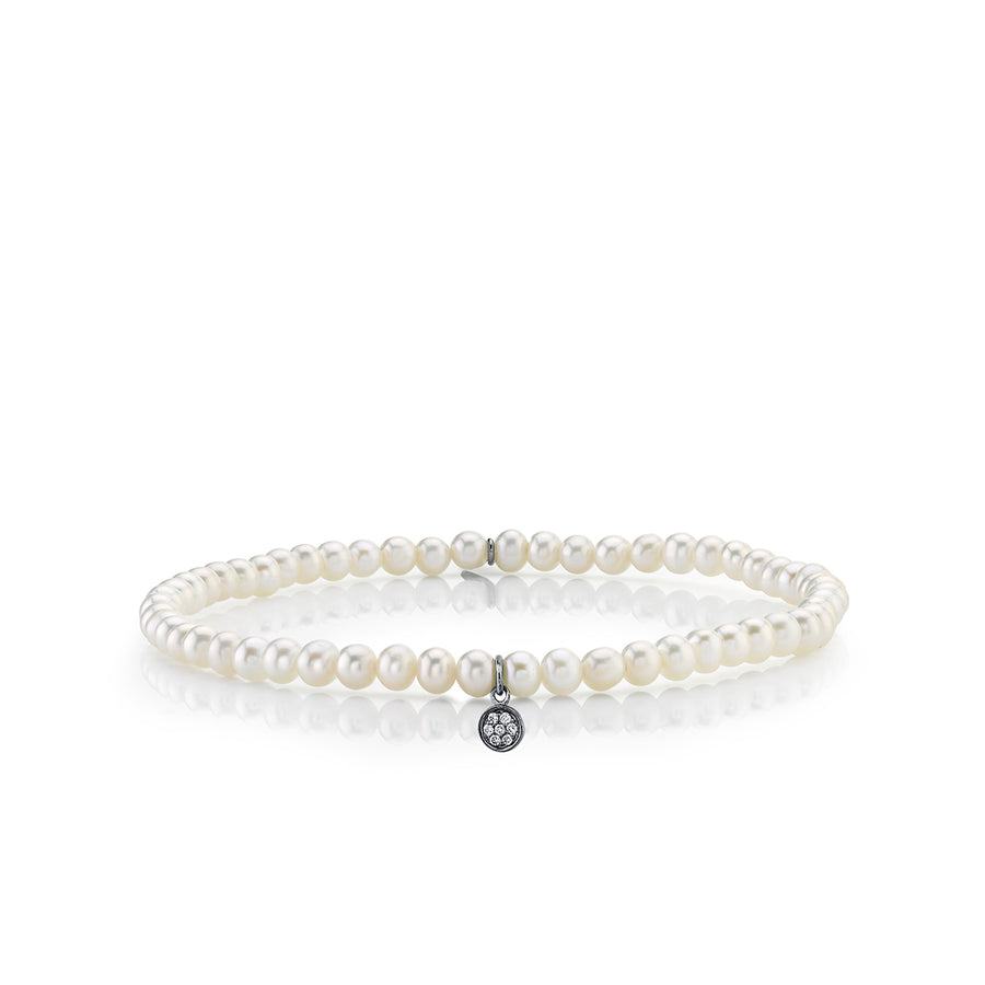 A modern twist on classic elegance, this bracelet features a black rhodium-plated mini disc charm set with shimmering diamonds—symbolizing clarity, completeness, and inner radiance. The charm measures approximately 1/8" in diameter and is strung on a strand of luminous 3mm white freshwater pearls, long revered for their purity, intuition, and timeless beauty.