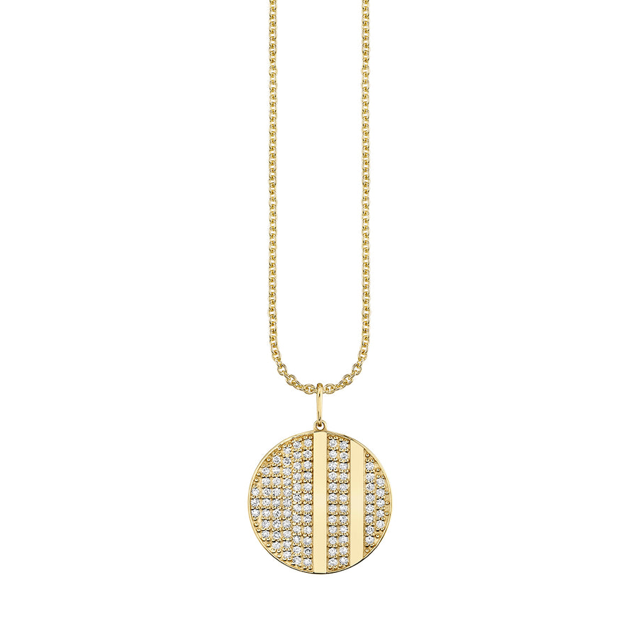 Add a modern twist to classic elegance with this 14k gold disc charm necklace featuring delicate diamond-set stripes. The charm measures approximately 5/8" in diameter, showcasing subtle texture and sparkle for a unique yet timeless look.