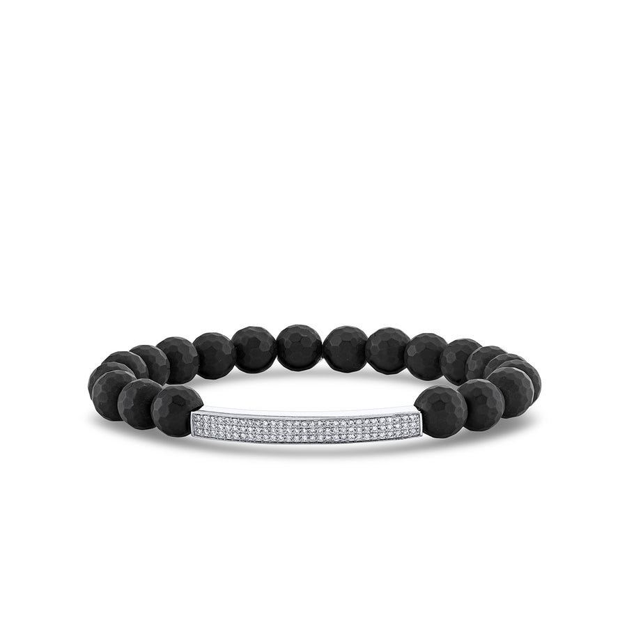 Elevate your style with this striking bracelet featuring 8mm matte black onyx beads, known for their grounding and protective energy. The centerpiece—a 14k white gold three-row bar adorned with shimmering diamonds—symbolizes strength and resilience while adding a touch of timeless elegance. Each bead is carefully selected for its natural beauty, with slight variations in color and shape that enhance the uniqueness of every piece.