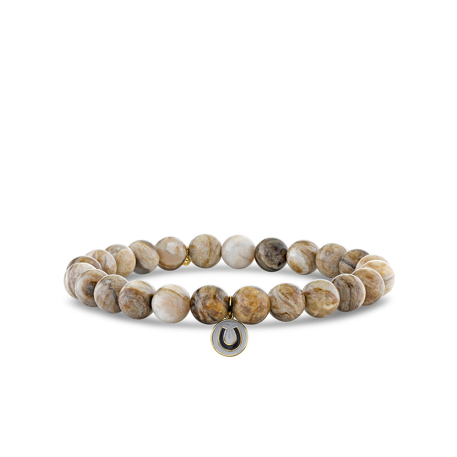 This exquisite Sydney Evan bracelet features a 14k yellow gold and enamel horseshoe charm, a timeless symbol of good luck and protection. The tiny horseshoe is delicately paired with 8mm silver leaf jasper beads, known for their grounding and stabilizing properties, creating a harmonious blend of elegance and positive energy. The bracelet is strung on a stretch cord for a comfortable fit and is adorned with a signature 14k gold SE logo charm. Due to the natural variations in precious and semi-precious stones, each bead may slightly differ in color and shape, adding a unique touch to every piece. The standard bracelet size is approximately 7 inches, and custom sizing options are available upon request. Perfect for layering or wearing alone, this piece is a meaningful accessory that combines beauty with the power of symbolism.